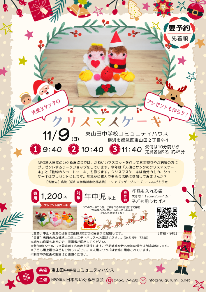 NPO法人日本ぬいぐるみ協会では、かわいいマスコットを作ってお年寄りやご病気の方にプレゼントするワークショップを開催しています。今年は「天使とサンタのクリスマスケーキ」と「動物のショートケーキ」を作ります。クリスマスケーキは自分のもの、ショートケーキはプレゼントにします。だれかに喜んでもらう活動に参加してみませんか?