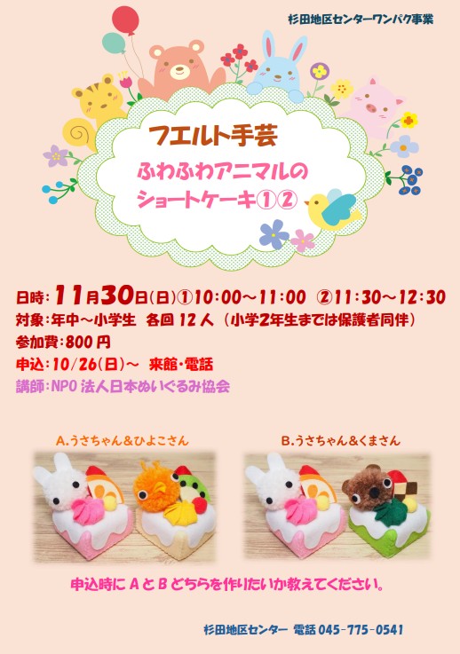 [11/30]フエルト手芸 ふわふわアニマルのショートケーキ(杉田地区センター)