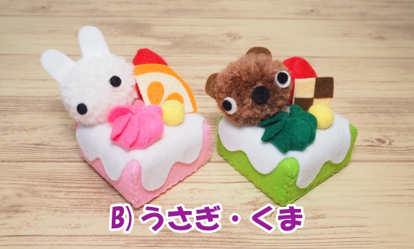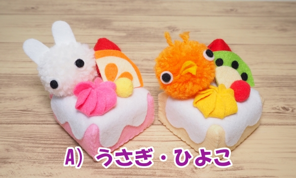 ふわふわのポンポンやフェルトを使ってかわいいショートケーキを作りましょう。3種類のうち2つを作ります。A)うさぎ・ひよこ B)うさぎ・くま お申し込み時にAかBどちらかご希望をお知らせください。