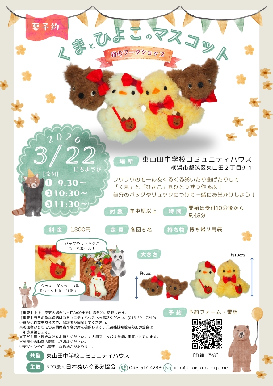 • 【必ずご確認を!】info@nuigurumi.jp.netからのメールを受取れるように設定してください。迷惑メールに分類されてしまうこともあるようです。メールが受け取れない場合は、お席の確保ができませんのでご注意ください。満席の場合は、当日いらっしゃっても参加できない場合があります。